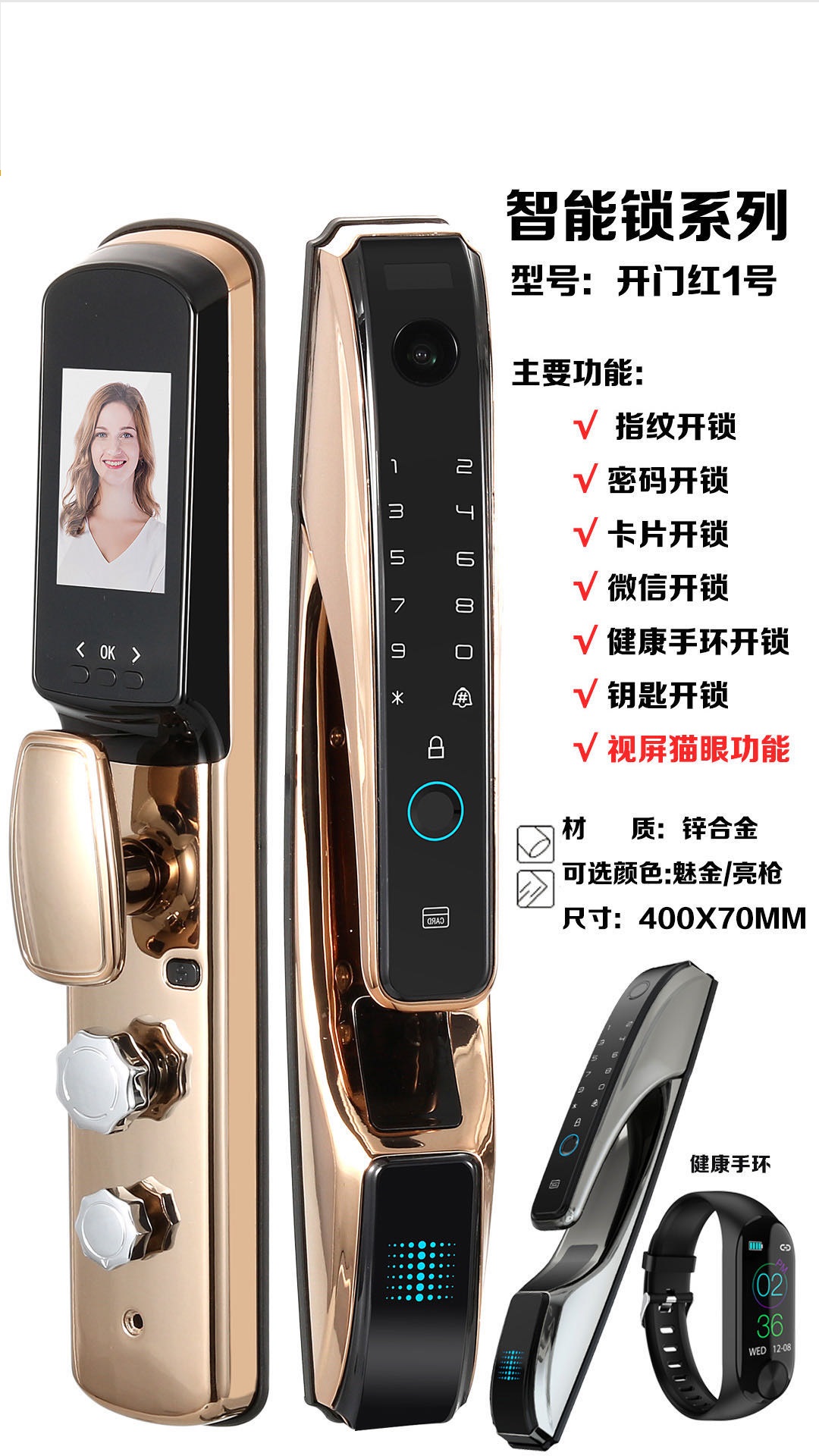 功能:指紋開鎖,APP遠(yuǎn)程開鎖,密碼開鎖,視頻貓眼功能,健康手環(huán)開鎖